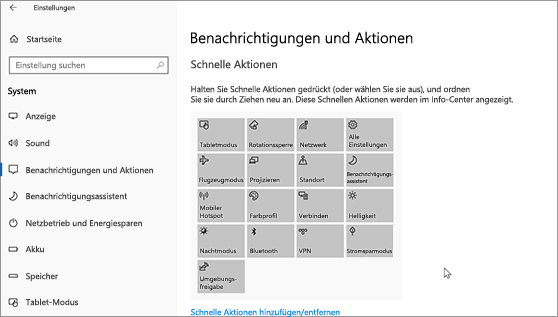Benachrichtigungen und schnelle Aktionen finden Sie in Windows 10 im neuen Info-Center. Die Einstellungen, wie und wann Ihnen Benachrichtigungen angezeigt werden sollen und welche Apps und Einstellungen Ihre wichtigsten schnellen Aktionen sind, können jederzeit angepasst werden.